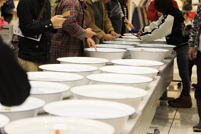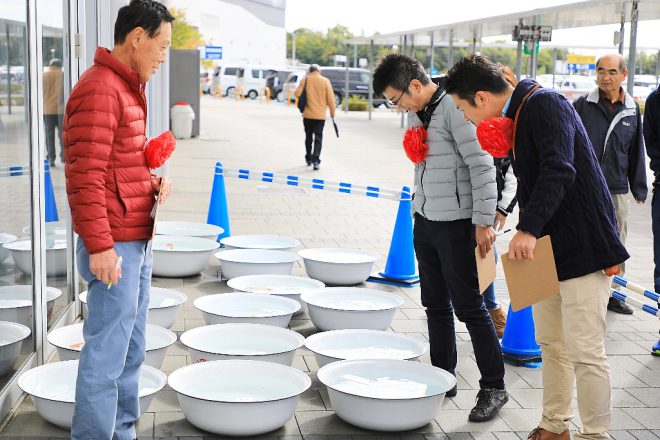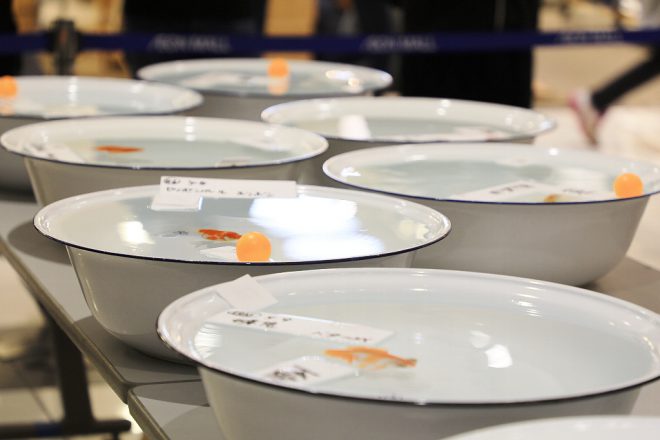取材に訪れたのは、イベント最終日の12日。いつものイオンとは少し様子の違うエントランス付近。真っ白い洗面器がズラリと。この日限りの注目イベント「金魚品評会」が行われていました。静岡などで行われるはずだった品評会や金魚日本一大会がそれぞれ台風の影響で中止になったり開催時間がカットされたりした影響もあってか、全国から200匹近くの出展があったそうです。もちろん来場者もハンパなく。そりゃあストレスもたまりますよね(笑)