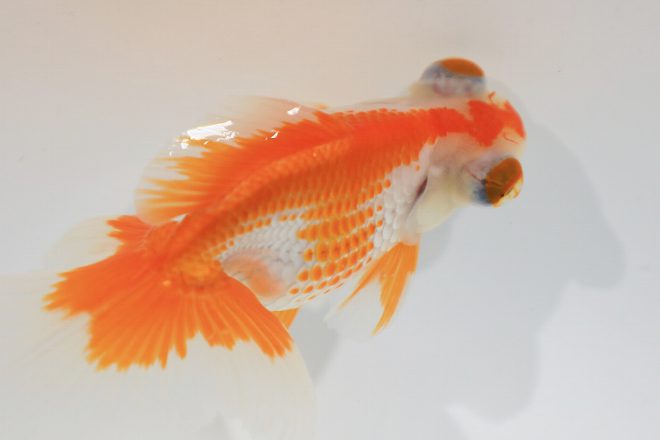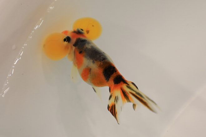 最終審査に残った金魚たち。オレンジ色のピンポン玉が目印です。