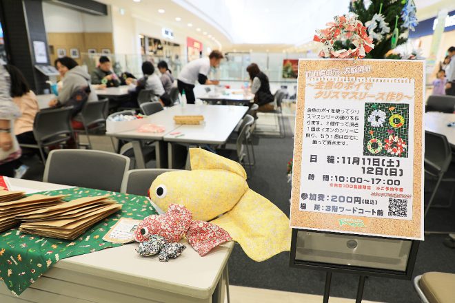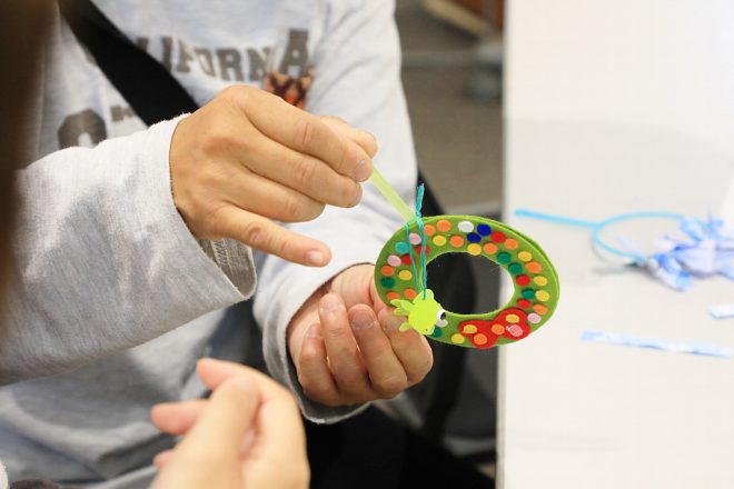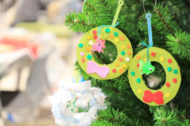 こちらは金魚にちなんだワークショップ。何と、金魚すくいの必須ツールであるポイを使ったクリスマスリースづくりでした。
