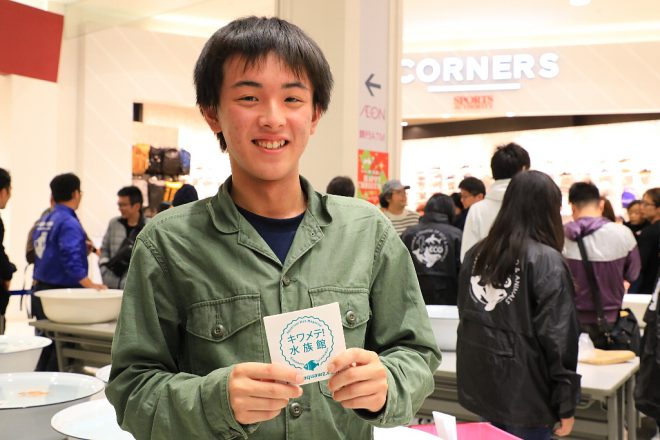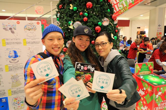 金魚が大好きでやってきたという3人のうちの、水江イングリッドさん(写真中)がこちらを指さして、「あー、この人知ってるー!」ってホンマかいな(笑)。どうやらインスタグラムやツイッターで、顔に見覚えがあったそうです。ちなみに、お父上がフランス人だそうで、さすがになかなかキュートです。右側の水江珠美さんがお母さんと聞いて、あまりの若々しさにさらに超ビックリ!そして「大人げない青年」の名は信定亮次さん(笑)。イングリッドさんと同じ京都水族館で働くスタッフなのだそう。「キワメテ!水族館」のステッカー、持ってけドロボー(笑)!