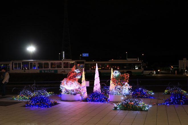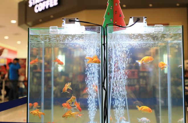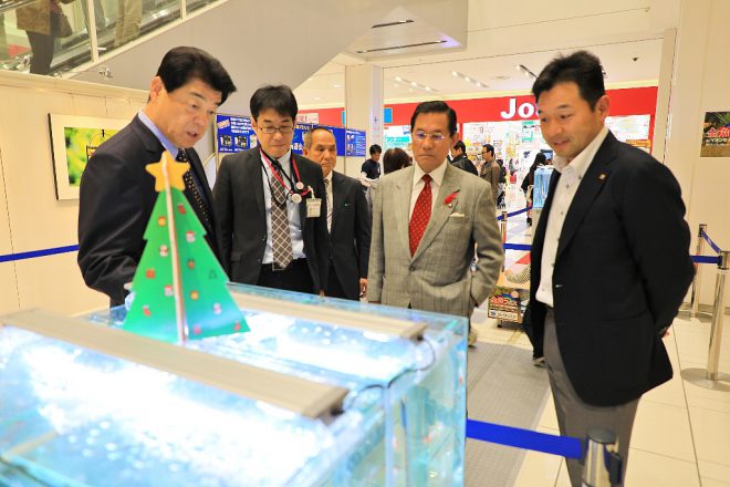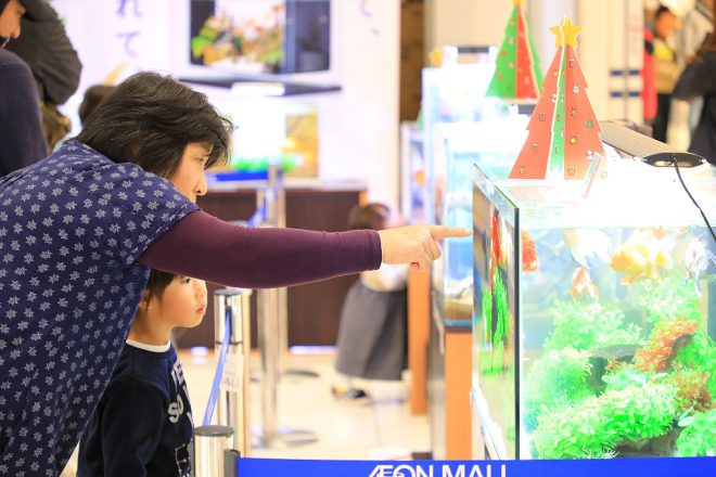 思った以上に、多くの人でにぎわっています。地元の水槽メーカー・KOTOBUKIが集結させた水槽の数は全部で34本。30㎝角水槽を中心に、60~90㎝水槽などバラエティーに富んでいます。また新製品の「アクスト」「アーク」「デビュー」などのスタイリッシュ水槽もラインナップ。明るいLEDと相まって、クリスマスムードも高まります。