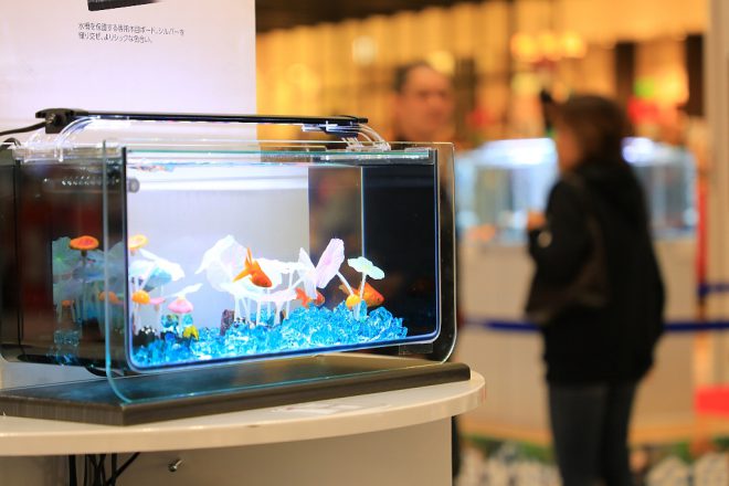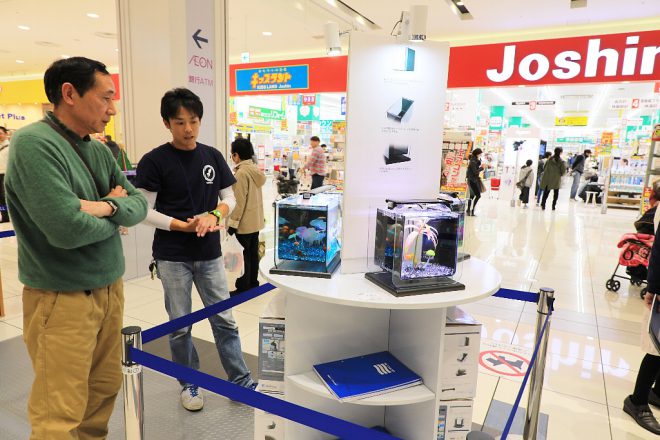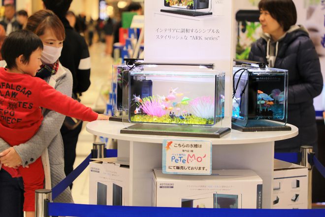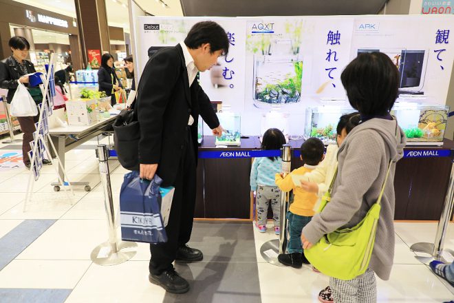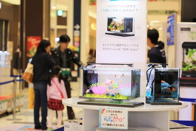 今春発売以来、好調な売れ行きを示しているスタイリッシュ水槽「アーク」。まるで水槽が宙に浮いているみたいで、カッコいいですよね。普段はモール内に常設されていますが、今回はちゃんと金魚たちが泳いでいます。