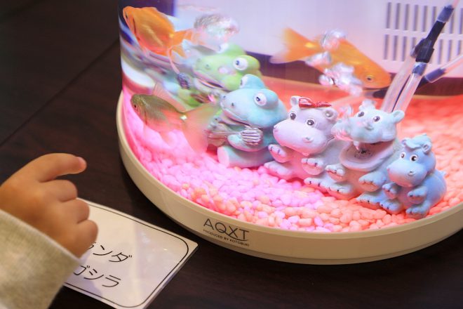 水槽の一部にカメラが組み込まれていて、アングルによっては水槽の中で金魚と一緒にいるような気分になる仕組みです。家族連れに依然根強い人気のこのコーナー、「金魚フェス」が終了してもこの場所に展示されていますので、今回行けなかった人もぜひ。