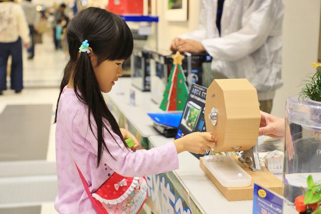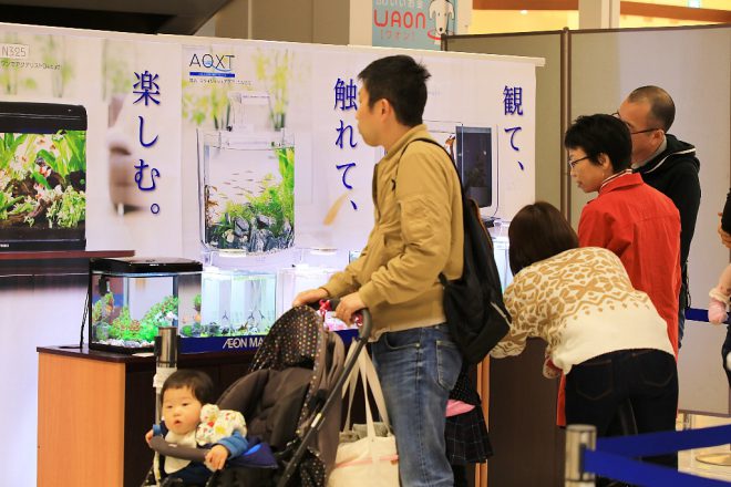 そうそう、夏の金魚すくい大会の会場でも人気だったガラポン抽選会を、今回も実施。水槽を買ってくれた人のみを対象に、賞品(オールインワン水槽「アクアステップ」)を目指してガラポンに挑む姿がありました。