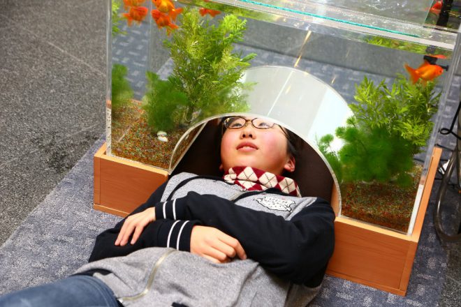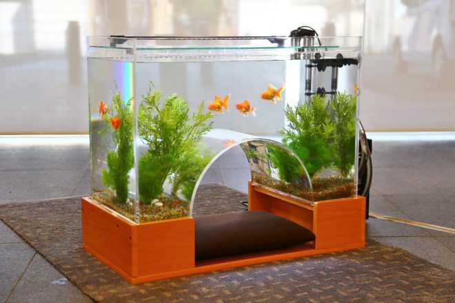 一見なんの変哲もない水槽なのですが、実は底がアーチ場になっています。そこに顔を突っ込めば、金魚たちを下からながめられるというアイデア。この発想は、もしかして普段からおうちでもゴロゴロしてるから(笑)?
