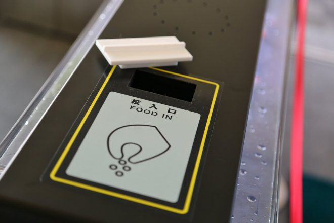 本物なら、ここからICカードや定期券を入れるんですが。ここでは金魚たちに食事をしてもらうべく、エサやり口となりました。城ホールのみなさん、これからどうぞよろしくお願いします(笑)!
