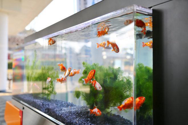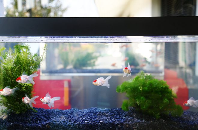 2台でワンセットとなる水槽そのものの大きさはそれぞれ120×35㎝。1台にコメットが、もう1台のほうには丹頂が泳いでいます。