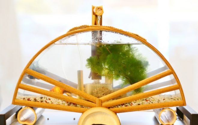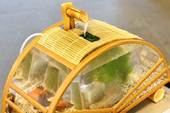 よくみると、フレームなど随所に竹が使われ、和でありながら扇子のイメージが保たれています。なおこちらの水槽は、大和郡山市役所のロビーに設置される予定です。あわただしい毎日の中で、きっと大和郡山市民の心を癒してくれることでしょう。