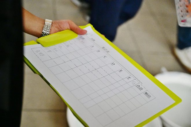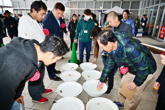 審査員がコレだ!と思った金魚にはオレンジ色のボールが投入されていきます。これだと、一般来場者の目にとまりやすくていいと思います。