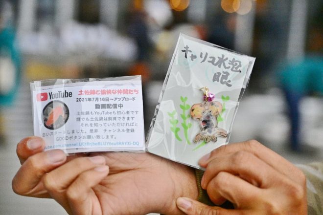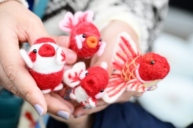 このほか、可愛い金魚たちと「遠足」がてらにやってきた山田さん(神戸市)も錦魚振興会のメンバー。聞いたところによると、北海道の有名な作家さんが羊毛フェルトでつくったのだそう。同じメンバーで動画配信サイトで情報発信する井上さん(寝屋川市)たちとともに、金魚一色の1日を楽しんでおられました。