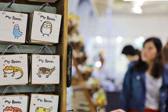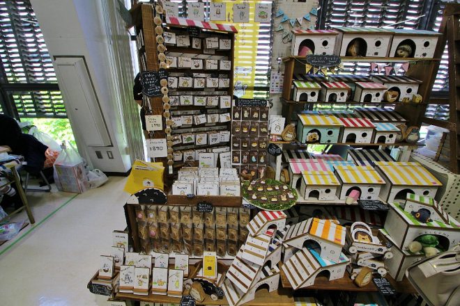 ハリネズミやハムスター・モモンガなど、小動物たちのおうちを製作・販売するJOHNNY HOUSEさんが今年も出品。主にケージ内にセットする「個室」や木工雑貨がメインで、何といっても可愛いデザインと色使いが女子好み。去年に比べてアイテムもかなり増え、こんなに見せつけられると後日個別取材したい気満々(笑)。