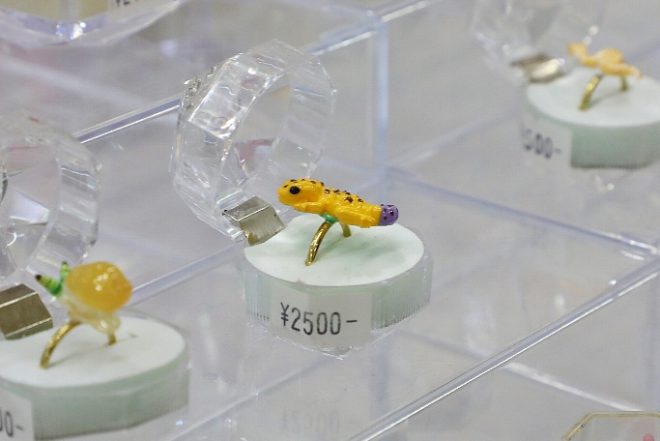 1㎝ほどの小さな樹脂でつくられたアクセサリー類には、手描きでカラーリングしたレプたちがいっぱい。これは女子ウケします。
