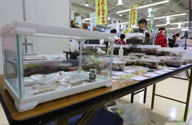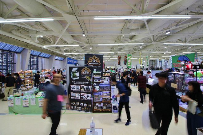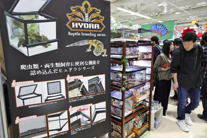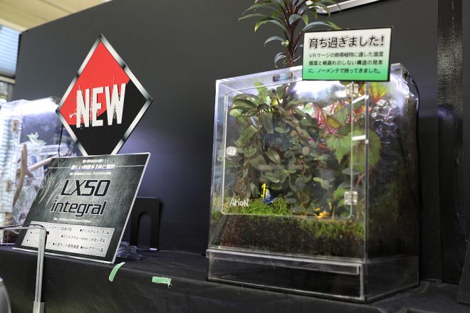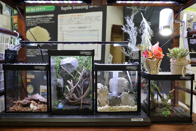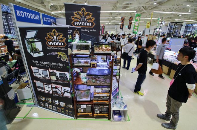 まずは神戸サンボーホールの2階、KOTOBUKIブースへ。去年より2倍サイズアップしたブースでは、伝説の五頭竜のマークでおなじみの爬虫類飼育用ケース「ヒュドラシリーズ」がズラリと並びます。