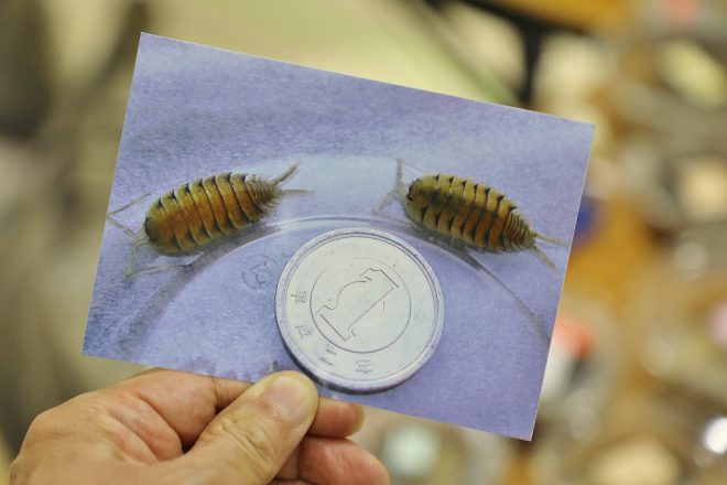 なので、ここでは三浦さん自身が撮ったというプリントを。写真でわかる通り、1円玉と比較するとこんな感じ。どの虫も体長1㎝未満のものばかりですが、ここまで拡大してみるとそんなにグロテスクではありません。実はこれ、スパチュラートゥズヘラオビワラジというイタリア産のワラジムシの一種で、何と7匹セットで12,000円。超レアもので、会期中10セット近く売れたそうです。