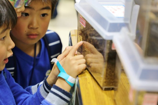 虫たちを食い入るようにみつめる子どもたち。子どもにとっては、カブトムシもワラジムシも同じ虫なんですよね。たかが虫、されど虫。いきものに分け隔てはありません。