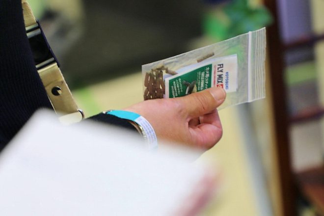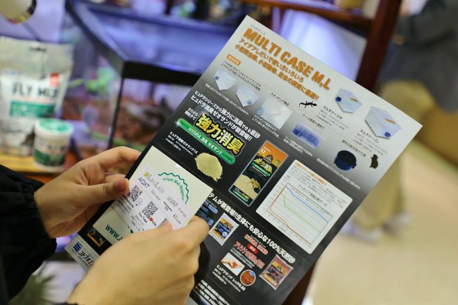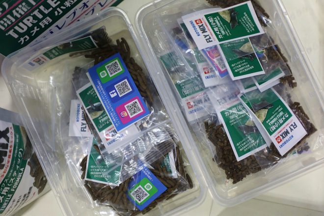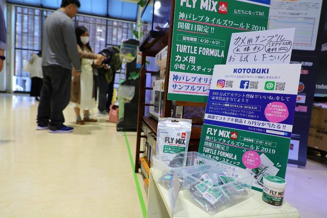 ブースでは、もうひとつキャンペーンがありました。生体の健康維持を目的に開発されたカナダ産のプレミアムフード「FLY MIX」を、ユーザー登録してくれた人にカメ用サンプルを無料プレゼント。意外と言っちゃ失礼なんですが、カメを飼育している人が多かったのには驚きました。ちっちゃな子どもが中心かと思いきや、なんのなんの若い奥様や独身女性にもカメファンが結構いました。この話はのちほど。