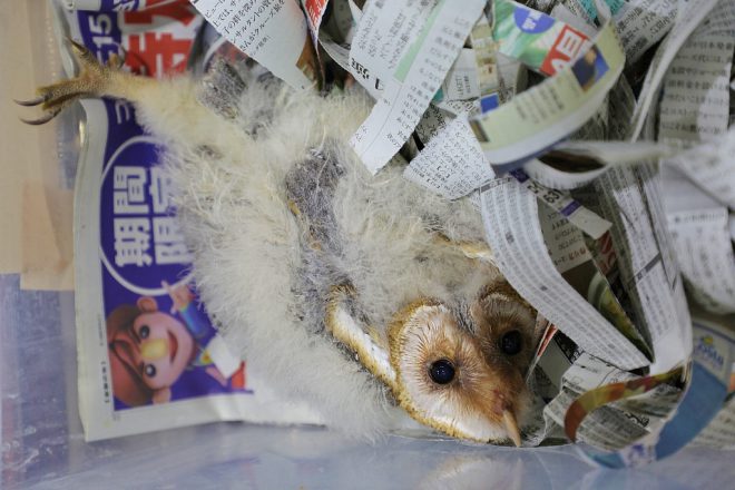 この日ブースのお手伝いをしていた女性スタッフも、大のフクロウ好き。でも飼育って大変なんでしょ?「いやいや、病気にならないように予防飼育を推奨してるだけですから~」とまたまた店長(笑)。すごいことをサラリと言ってのけるあたり、これはきっと奥深い話が聞けるに違いありません。何も知らないメンフクロウ君、あられもない格好でお昼寝中でした(笑)