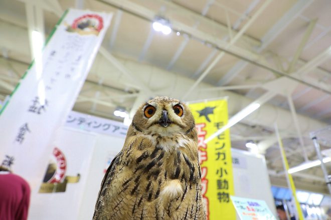そういえば、猛禽類というジャンルも未知の世界だったことに気づきました。とあるブースで聞き込みを行ったところ、古都奈良で最近ショップを構えたという噂を聞きつけて足を向けたのが、ハンティングアニマルさんのブース。「いやいや、特別変わったことはしてないですよ~」と仰る店長さんは、奈良は奈良でも、生駒山のふもとに出店して間もないそうです。