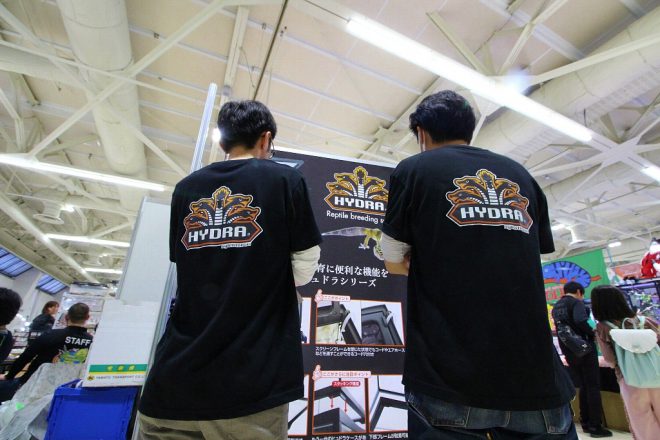 商品の問い合わせに忙しいスタッフ。今回はヒュドラケースが中心の展示でしたが、やはり水槽メーカーらしさをアピールすべく、レイアウト水槽を展示しようかという話もちらほら。レプのイベントだと、どうしても会場が乾いた雰囲気になりがち。アクアの水槽があるだけで、きっと会場に潤いを与えることでしょう。