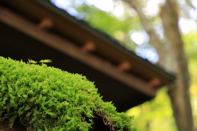 屋根の上には、青々としたシノブゴケが。少々水がなくても簡単にへこたれません。逆に雨などの水分が多すぎると、逆に茶褐色に変色してしまう可能性も。それはそれで風情があるのも、また苔の魅力といえるでしょう。