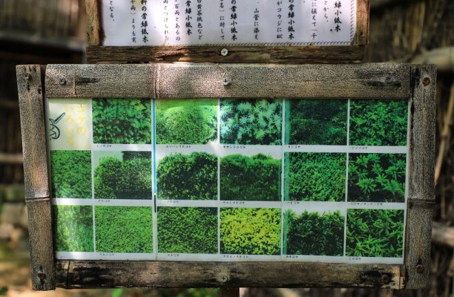 苔の種類は、小さいものも合わせると40種類以上あるそうです。境内の苔を紹介したこんなパネルもありました。みなさんなら、いくつくらいわかりますか?