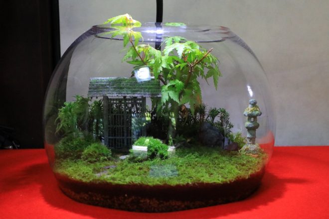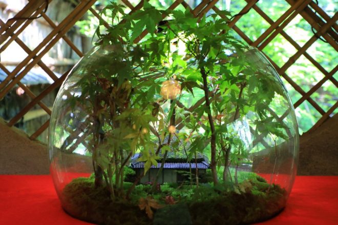 ガラス容器の中には、お寺の一部がジオラマ風に再現されているものも。実際のお寺と作品の見事なマッチング。ついさっき歩いていたお寺の風景が作品でもう一度見られるとあって、なかなか心憎い演出です。これらの作品は、すべてとある苔作家さんが製作。一体どんな人がって?それを言うのはまだ早い(笑)