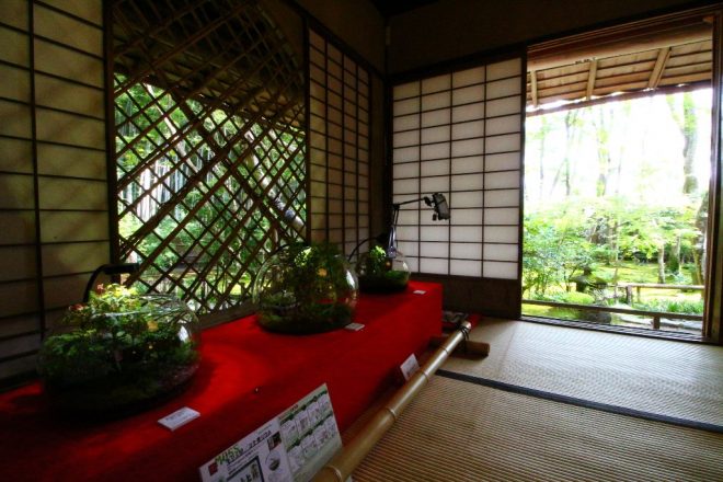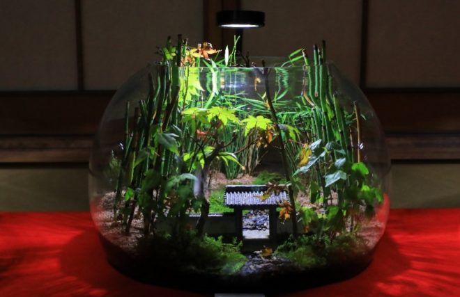 キャンペーンにちなんだ作品は一番奥の茶室に。再現されていたのは、境内に入る前に見た総門付近。やっぱりそうきましたか(笑)。コツボゴケやトヤマシノブゴケなどの苔のほか、ササの仲間であるトクサやミズトクサ、そしてヒメササなどを竹に見立てて、竹林のイメージを創出。苔だけでなく、ほかの植物を使ってリアルに演出するあたりはさすがです。