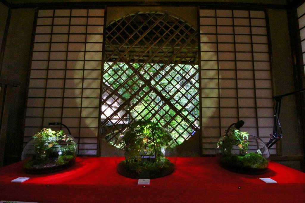 吉野窓を背景に展示されたコケ寺リウムといわれる作品。朱色の毛氈と相まって、はぁ~思わずため息が出てしまいます。しかも、時間が許すならいつまでも見入っていたい。こういうのに女子は弱いんです(笑)。