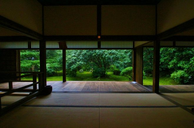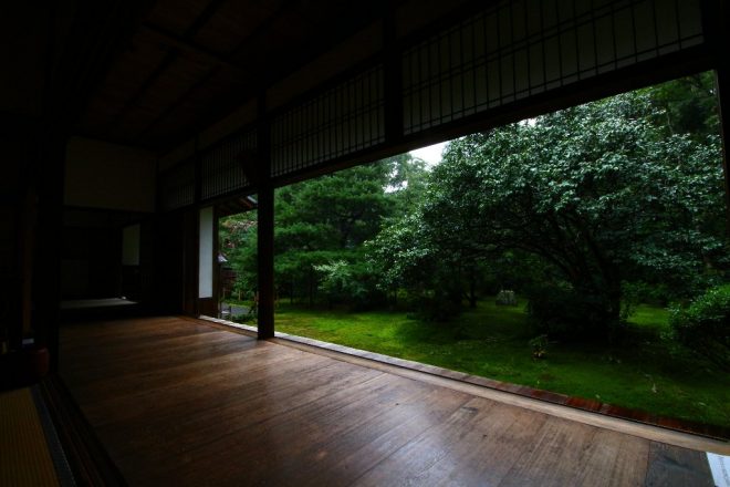 雷雨が通りすぎたばかりの庭園と縁側。雨露に濡れた苔たちの生命力を感じずにはいられません。思わず背筋がしゃんと伸びました。
