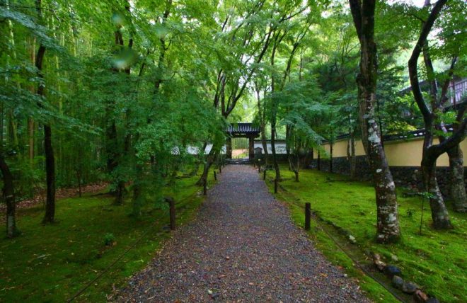 参道の両側には、絨毯のような苔がひたひたと。祇王寺同様、山が近くて苔が育つにはベストコンディションの環境です。実はこの時、急な落雷で足止めされたのですが、かえってそれが苔たちをいきいきさせているような気がしました。