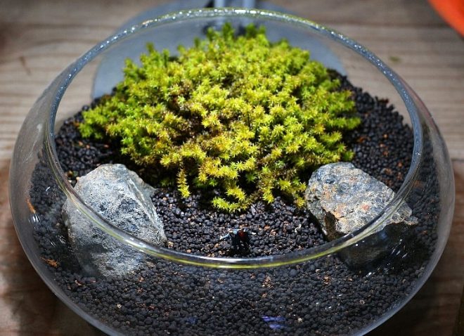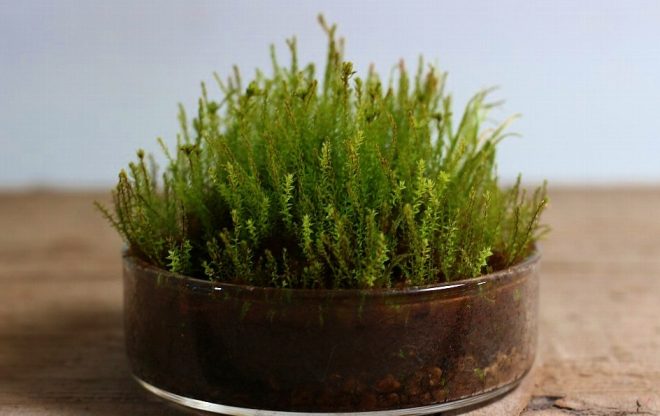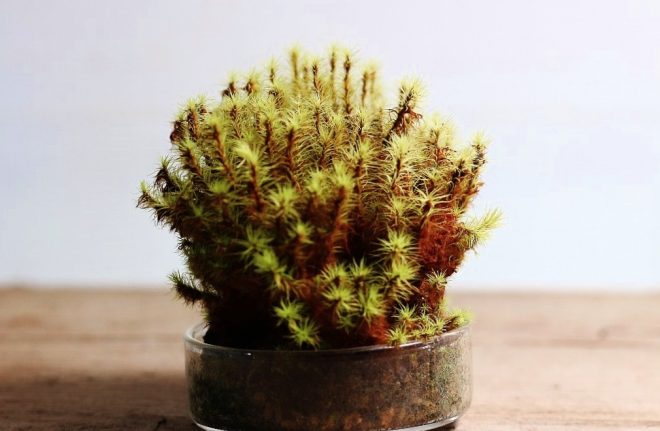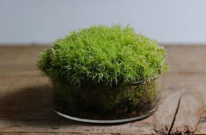 よく見ると葉が透明なコツボゴケ。キラキラしているので、苔テラリウムのアクセントとして使うのにも重宝します。半日陰、湿気を好み成長も早め。葉っぱが透明で、水をやるとがキラキラして印象的です。湿気を好むということは乾燥には弱いわけで、極端な乾燥を繰り返すと弱ってしまうので密閉型の容器での成育が向いています。