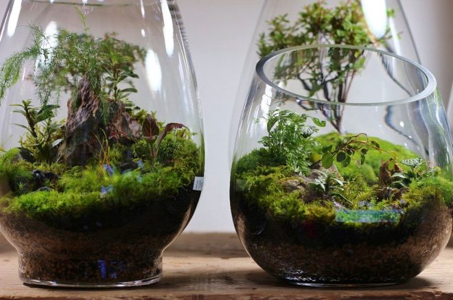 今田さんによると、テラリウムというのはアクア業界が使う言葉で、苔がメインではなく実際に苔を使っていないものもそう呼ばれることが多いのだそう。一方、コケリウム、苔テラリウムというのは苔がメインのものを指すそうで、ほかの植物と一緒にそれぞれの苔の特性を生かして育てていく楽しみがあるのが苔テラリウムだということらしいです。世間ではかなりごっちゃになっていますが、今田さんが手がける作品の大半が苔テラリウムということになるのでしょう。