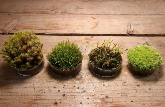 写真左から、タマゴケ、コバノチョウチンゴケ、コツボゴケ、ホソバオキナゴケ。すべてシャーレにドーム型の蓋をして湿を多めに保っているため、通常販売しているパックの苔とは色や姿などが違って見えると思います。同じ苔でも環境が違うとこれほど違うという、いい見本にもなるような気がします。
