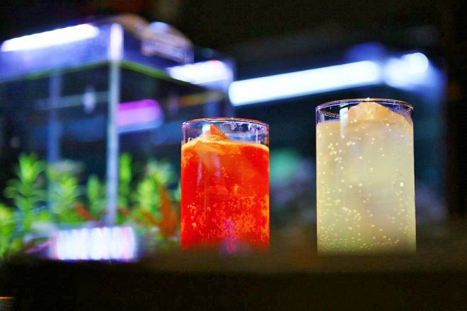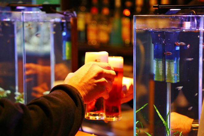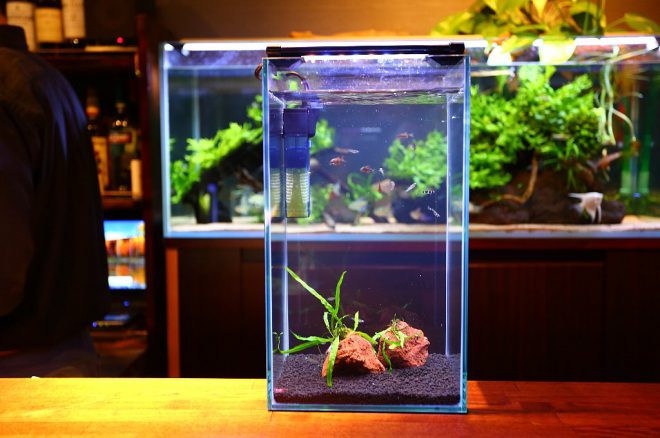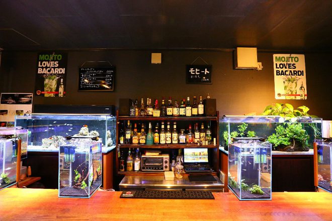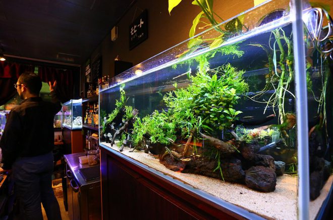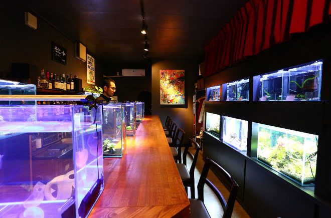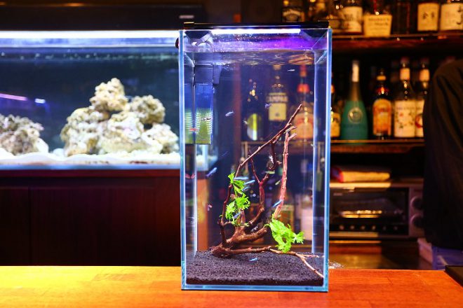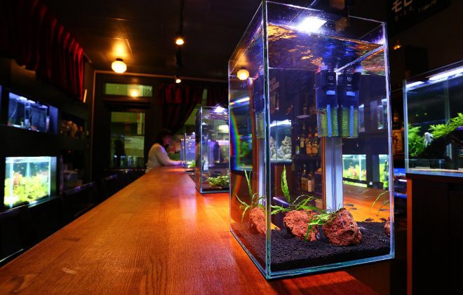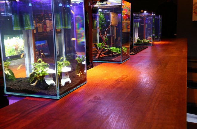 それでは、メインのカウンターテーブルへ。以前は幅30㎝×高さ20㎝の水槽が6つ並び、カウンターでお酒を飲むお客さんの目を楽しませていました。今回はやや小さい幅20㎝水槽にオールリニューアル。しかしその分、高さ35㎝の水槽に変更したことで、お客さんの目線とほぼ同じ高さになりました。そういえば、以前はお客さんがかがむようなかたちで水槽に見入ってましたっけ。あれはあれでよかった気もしますが(笑)。「もっと楽な姿勢で見てほしくて」と細やかな心遣いの近藤さん、お仕事中でも頭の中で試行錯誤を繰り返していたのでしょう。