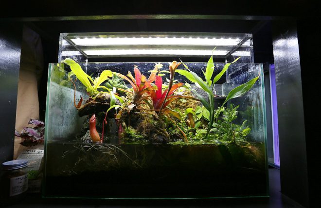 新たに90㎝水槽3台も加わりました。本格的な水草水槽、海水魚専用のオーバーフロー水槽、そして食虫植物を取り入れた本格的テラリウム水槽など、それぞれ趣の異なるテーマでお客さんの目を楽しませています。このあたりにも、近藤さんの思いが「見せ方」としてパフォーマンスされているような気がします。