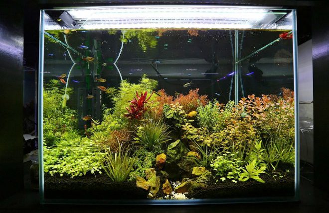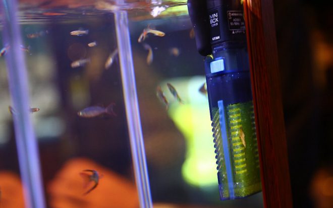 水中式ポンプもKOTOBUKI製を。水槽のコーナーにコンパクトに設置できるので魚もみやすく、こういったシーンには最適かもしません。