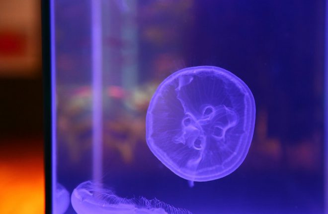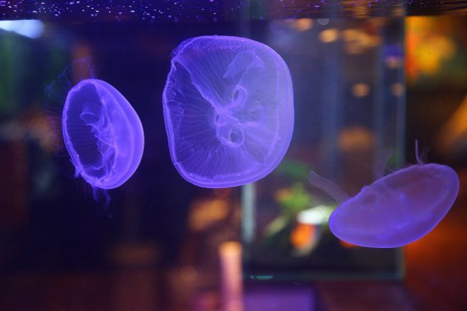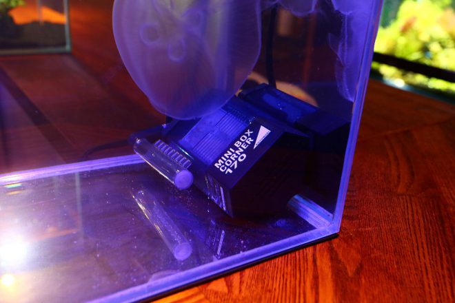 最後にどうしてもご紹介したかったのがこれ。そう、クラゲがいるんです。ビックリでしょ?しかも特別な水槽で飼育されているわけでなく、ブルーのLEDのエキゾチックな光の下で悠々と。