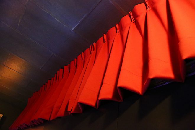 天井との間にはエンジ色のカーテンが。玄関のカーテンと同色にすることで統一感も生まれ、インテリア目線でみても素敵な空間になりました。