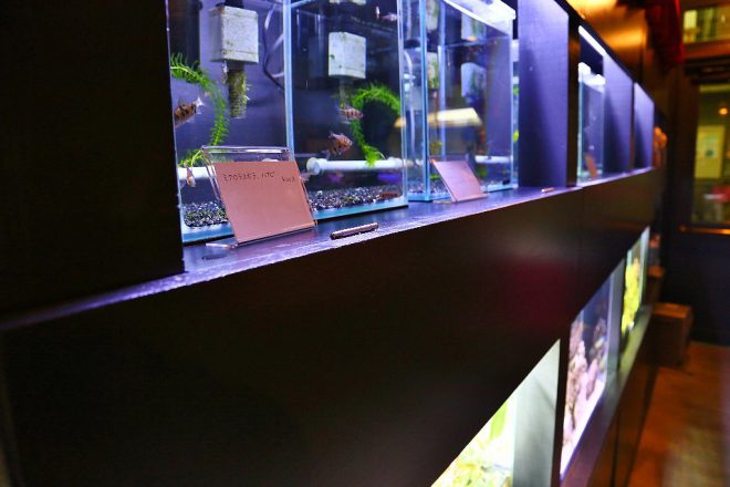 以前は隙間なく置かれていた水槽(写真上)も、今ではたっぷり空間をとって余裕の見せ方を。たくさんワチャワチャあるよりも、このほうが見てもらいやすいのだとか。しかもメンテも楽という利点も。見た目にもよく、使いやすいというのが何よりですね。