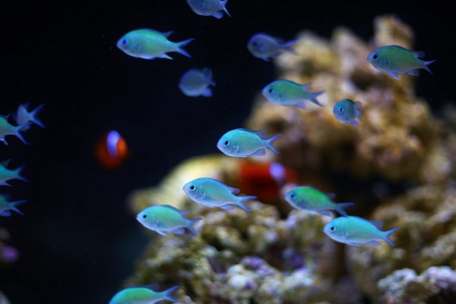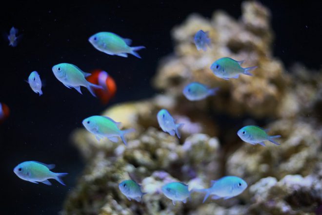 店にきた時から気になっていたこと。それは、左側の120㎝水槽の海水魚が、近藤さんの動くほうへ常に移動していることでした。「エサをもらえると思ってるんでしょ(笑)」だそうですが、フレンドリーな感じにとても癒されました。ちなみにデバスズメダイという海水魚で、用がない時は岩陰に隠れてひっそりとくらしています。ご来店の際はぜひご注目を。