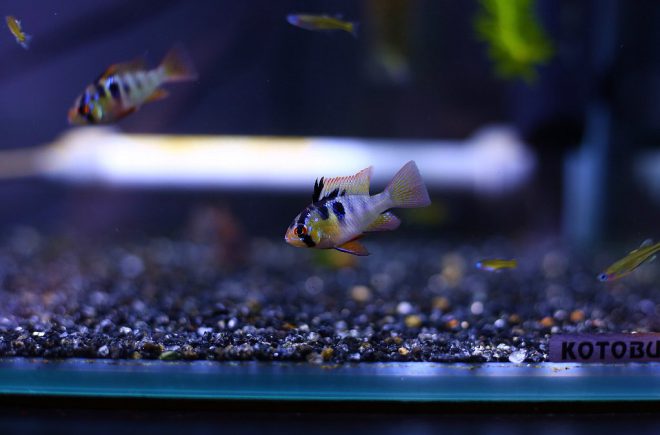 泳ぎ方が可愛いと近藤さんお気に入りのオランダラミレジたちが泳ぐ水槽は、すべてKOTOBUKI製。「一番信頼性のある水槽ですから。色々なメーカーのものを使ってきたからこそわかる結果なんです」(近藤さん)。確かに比べてみないとわからないことって結構あります。