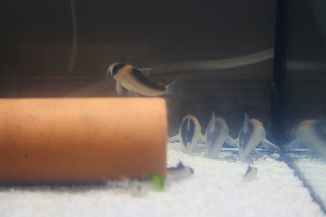 同じ水槽にいるロンドニア8と、どの個体よりも大きくどっしり構えているスーパープルケールの揃い踏み。お行儀よく4匹並んでいました。きれいに横並びでいることの多いコリドラス、人知れず不思議な法則でもあるのかなと思ってしまいます。
