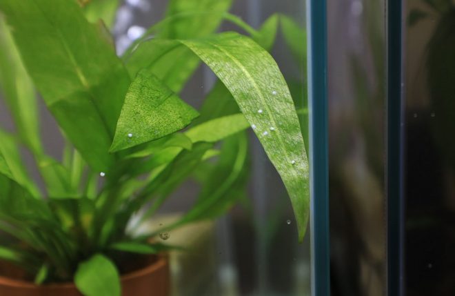 あ、キラキラしたツブツブの卵を発見が。水草だけでなく、水槽そのものの内側にも産みつけるのだそう。新しい命の始まりですね。ちょっと感動してしまいました。由美さんの気持ちがわかるような気がします(笑)
