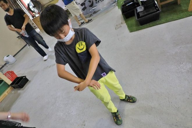 小学2年生の一人息子の珠祿(みろく)君とはいつも一緒の仲よし親子。工場でもメダカイベントでも。屈託のない彼の笑顔を知らない人は、メダカイベントにまだまだ行き足らない人たちかもしれませんよ(笑)。