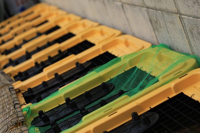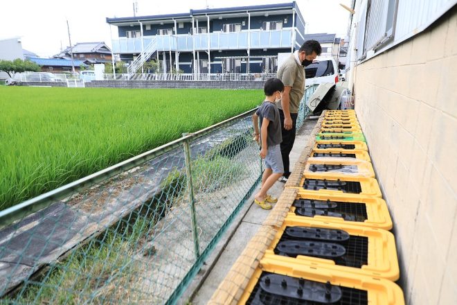 コンテナボックスのふたをカットして網でガード。さらにプランターの床などで使われているパーツ2個で二重ガード。これならメダカ泥棒も為す術なし。もちろん防犯カメラも随所に設置され無人時の対策は万全ですが、「どちらかというとアライグマ対策なんです(笑)」。ラスカル君、これもメダカのためだから諦めてね(笑)。
