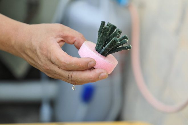 そういえば、アクアユーザーって市販品をうまく流用する人が多い気がします。この産卵用のスポンジもそう。元はといえば100均ショップなどで市販されている、プールスティック。これを産卵床の浮輪部分に流用。本来なら子どもがプールで使うアイテムを、メダカのためにアレンジメント。これを最初に思いついた人って天才?「100円ショップなどでこれをたくさん買い込んでいる人がいたら、おそらくメダカユーザーだと思います(笑)」。