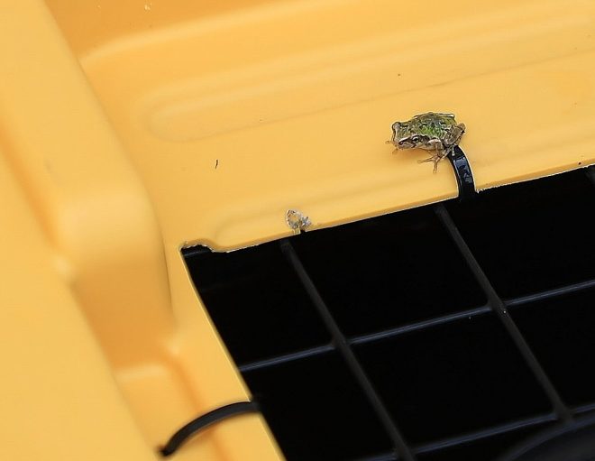 アマガエルが1匹エントリー。メダカといっても自分よりバディが大きいから、上から指をくわえて見ているだけだそう。「水の中に落ちることもありますが、自分でいそいそと這い出してきます」。メダカ、アライグマ、アマガエル。なんか風情があります(笑)。