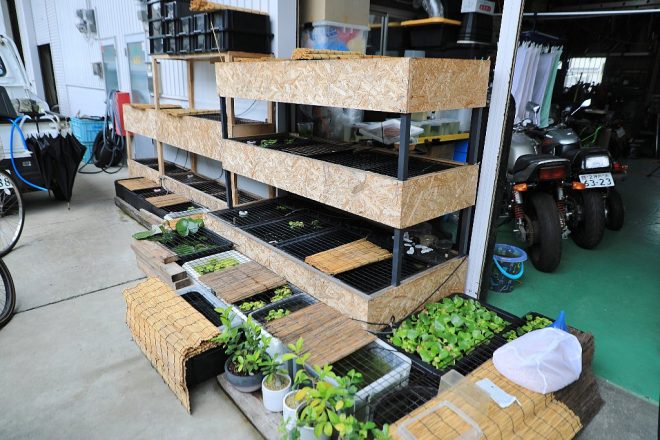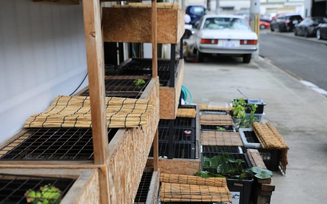 特筆すべきは工場の場所的条件。飼育ケースが工場の東側に並んでいることで、一日の始まりとともにやわらかな陽が均等にあたり、約半日は陽あたり抜群。そして建屋の構造上、正午をすぎると一転日陰に。「まる一日陽があたるわけではなく、かといってずっと日陰でもなく。まだ正確なことはわかりませんが、そうした条件が個体にとっていいように思うんです。現に、今年に入ってからここで育った個体は、とても元気がいいんです」。環境が生み出した絶妙なさじ加減。腹八分目。これぞ、こうばめだかの神髄。