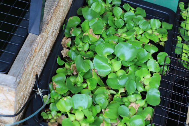 ホテイアオイが育成中ですが、前列と後列とでは微妙な差が。はやり陽のあたり方で育ちに差が出るそうです。
