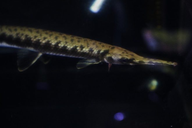 おお、これは200㎝水槽でゆうゆうと泳ぐのは、ガー。3才のわりにはやや小ぶりですが、「盆栽飼育しているからだと思います」。エサを少なめにして、より自然に近い環境で飼育したかったからだとか。メダカと出会う前、熱帯魚はもちろん肉食魚が好きだったというしもやん。アロワナやスポッテットガーなどの大型魚の飼育経験も。事務所に入る直前、メダカ以外もいるというのは、これだったんですね。